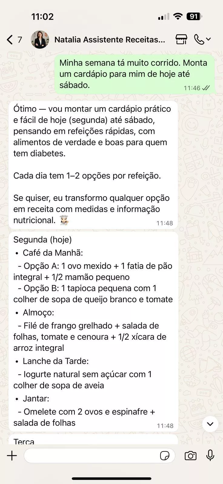 Achava que comida de diabético era só salada sem graça. A NATALIA me deu umas ideias de carne e massas que eu nem sabia que podia. Minha comida voltou a ter sabor.